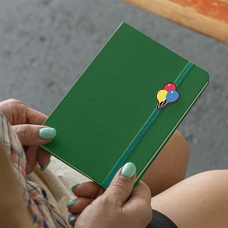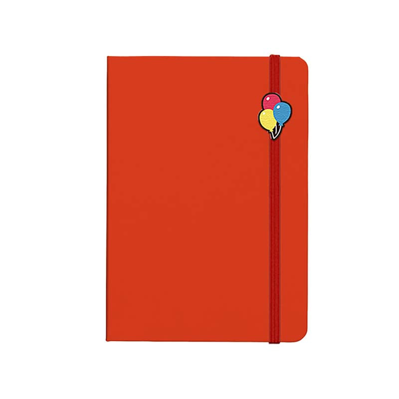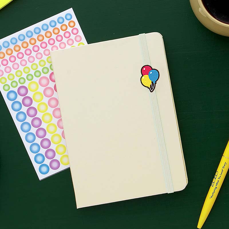A hard-cover diary with an embroidered charm and a movable balloon charm.