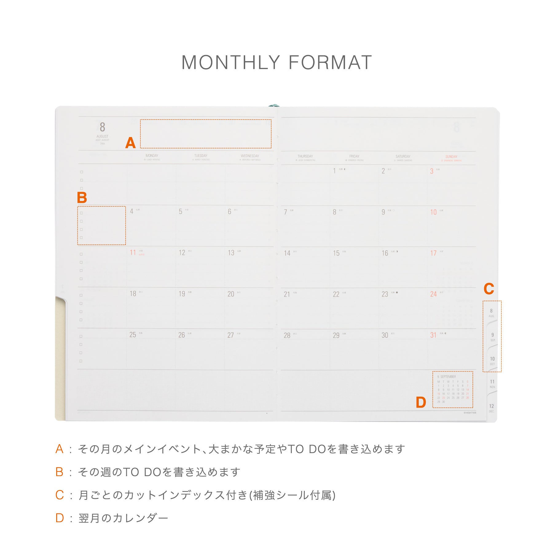 - Monthly index for quick navigation to desired pages.