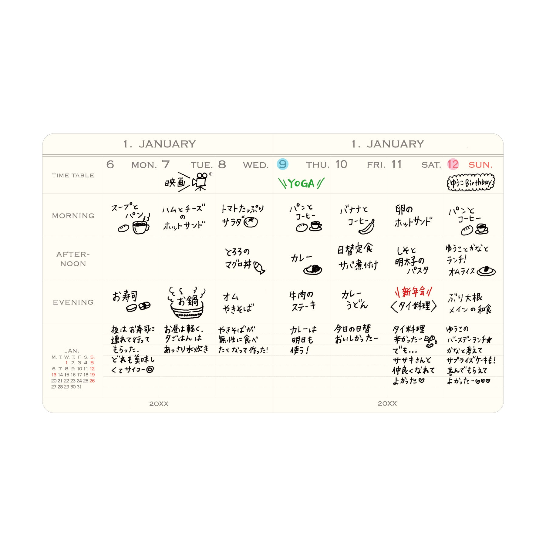 - Weekly page design allows for separating plans or records in the upper section and writing a 7-line diary in the ruled lower section.
