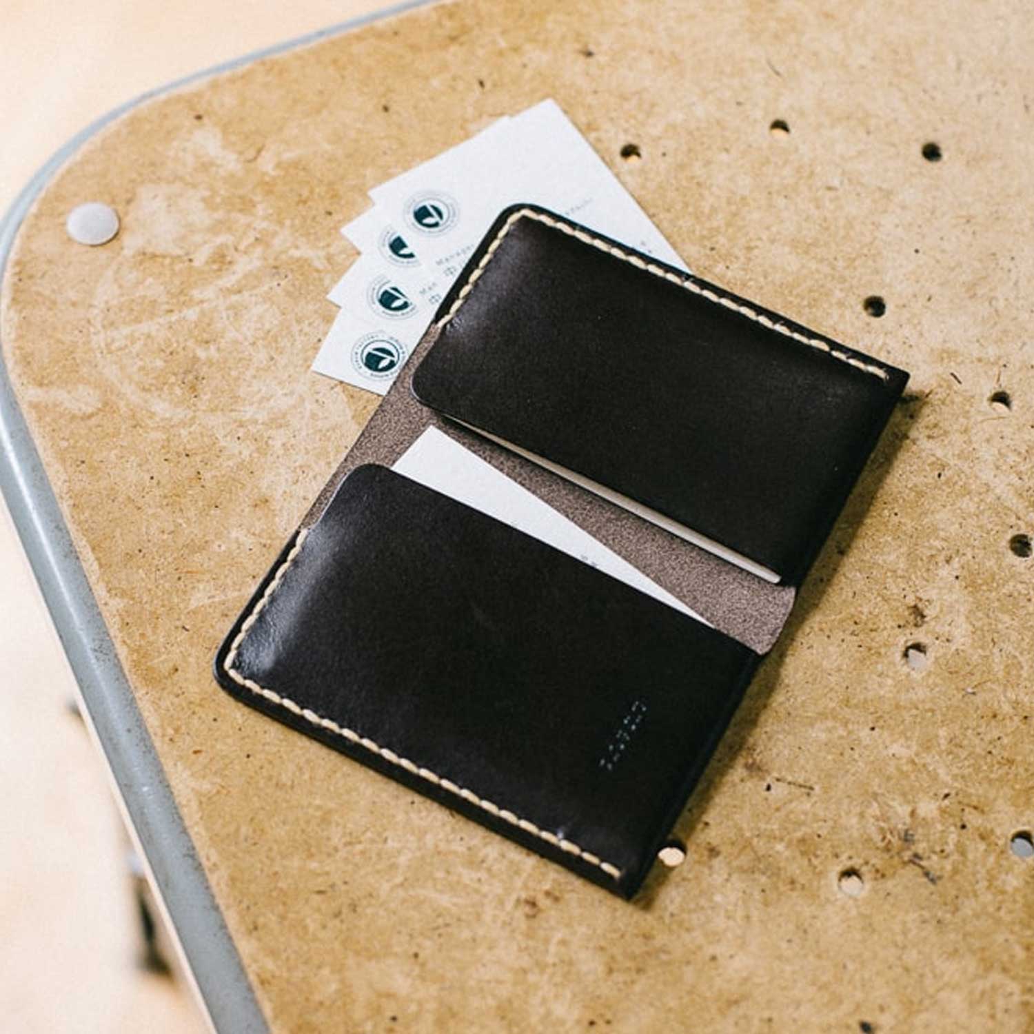 A hand-stitched card case by Duram, a leather goods company from Fukuoka, Japan.