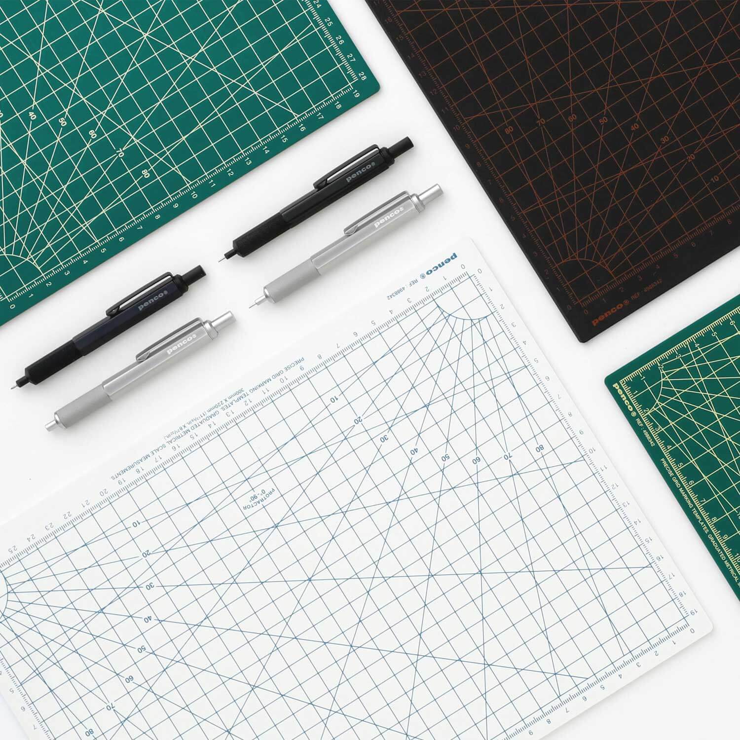 A superior quality 5 layer-construction PVC cutting mat by Penco, developed with a veteran cutting mat maker from Japan. The A4-size cutting board is sturdy, bend or flake-proof, and safely grips the blade as well as paper with its subtly textured surface. The blade mark disappears, absorbed by the soft yet tough PVC surface, where plenty of guidelines are printed.