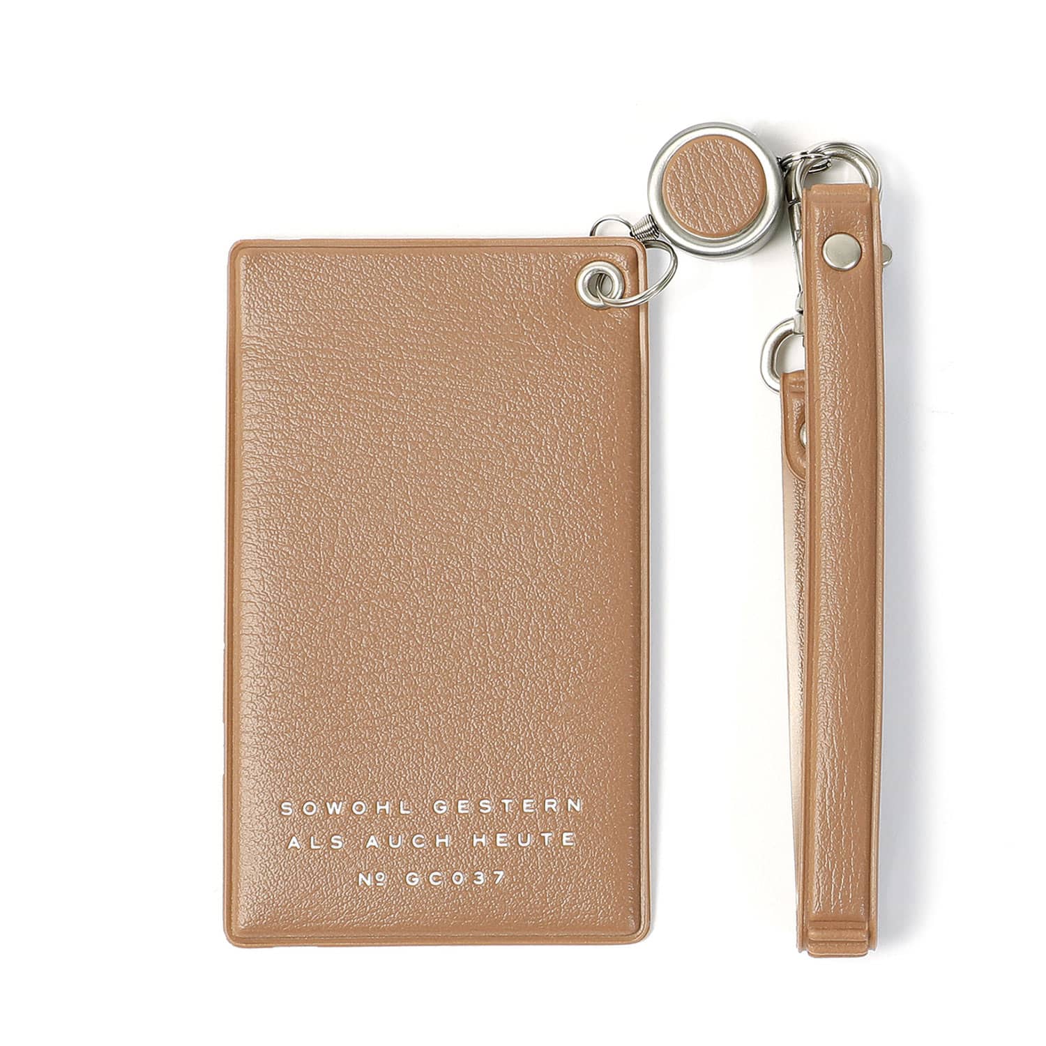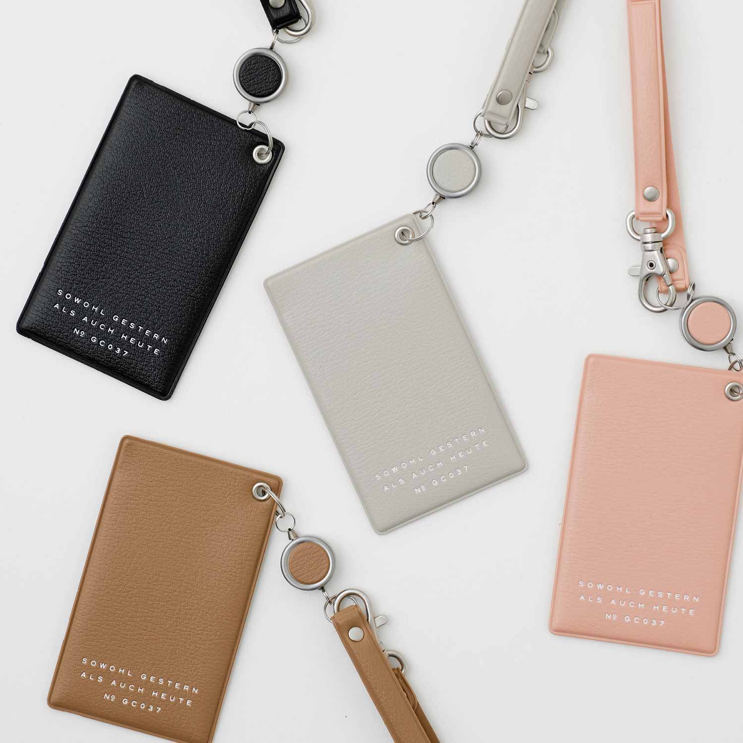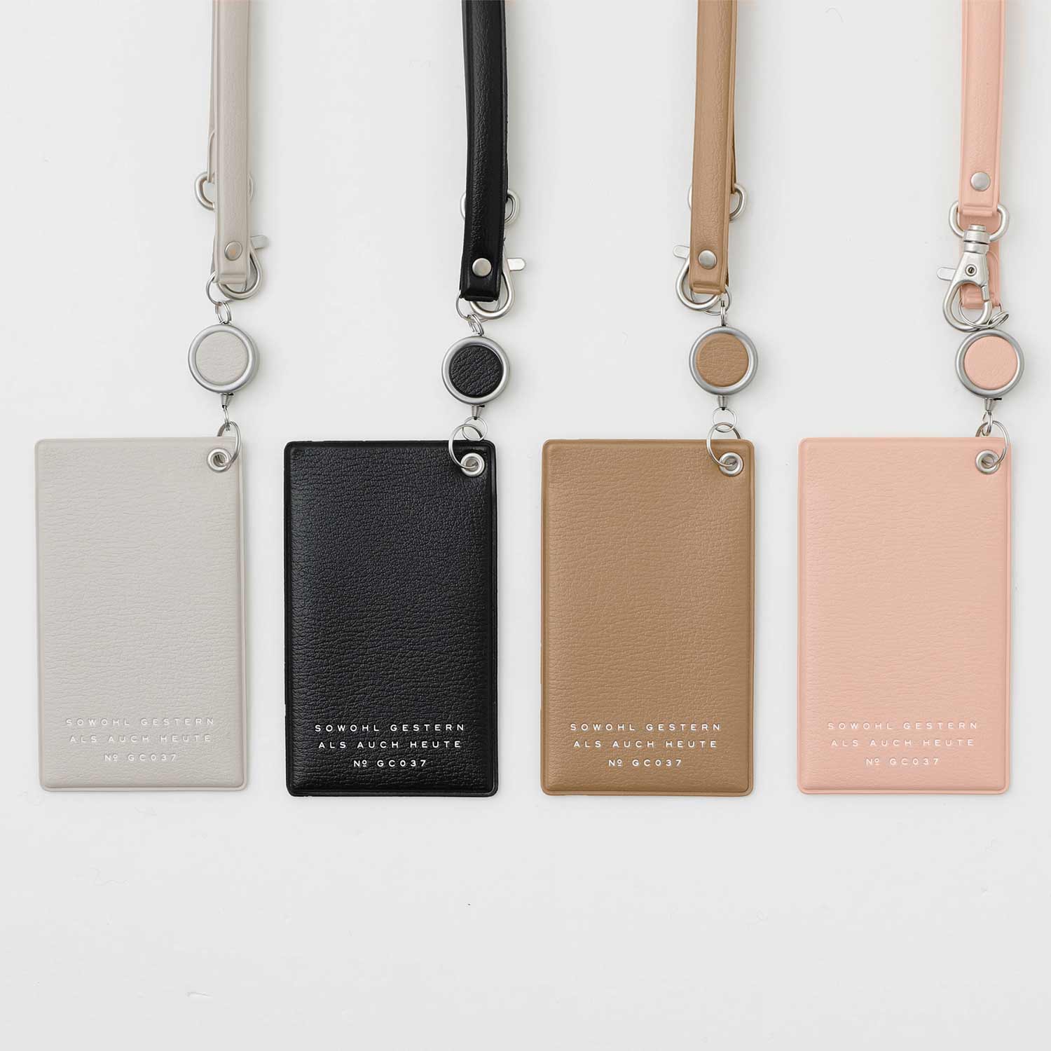 Made of PVC, a faux-leather material that resists water and dirt, while being light and durable. The retractable reel is attached to a faux-leather strap with a metal lobster clip on its end.