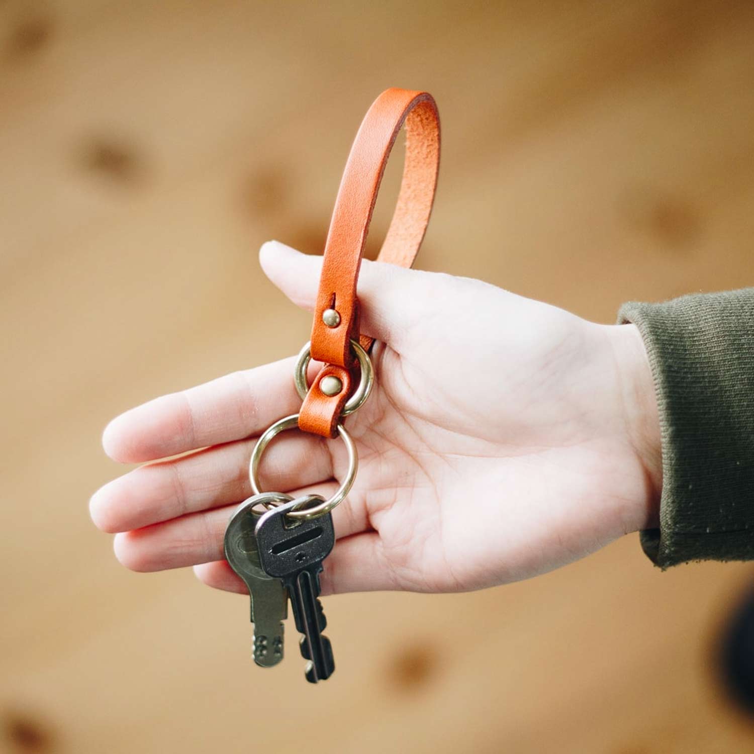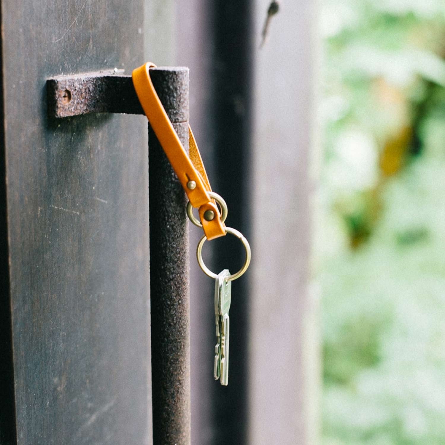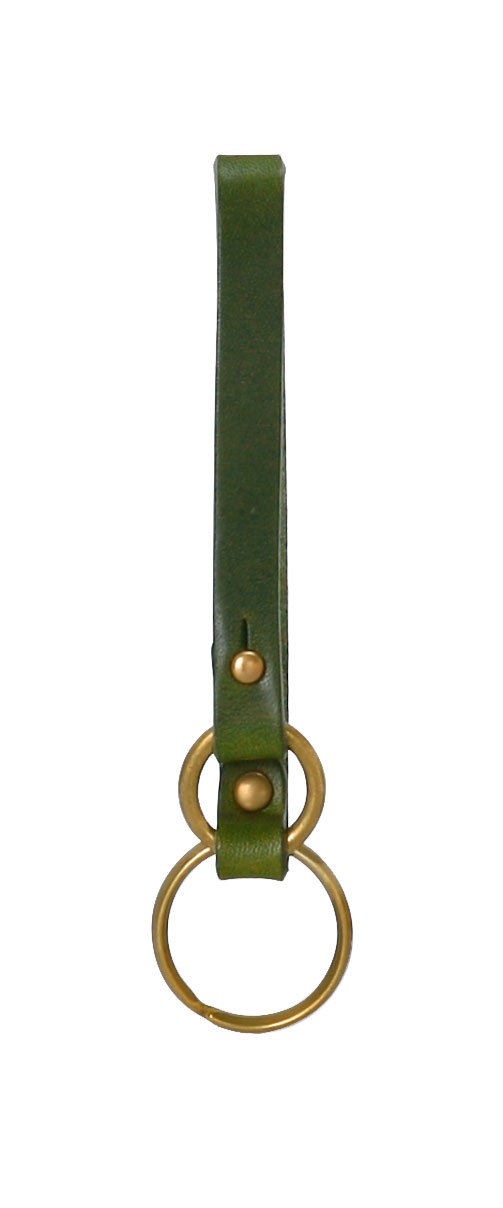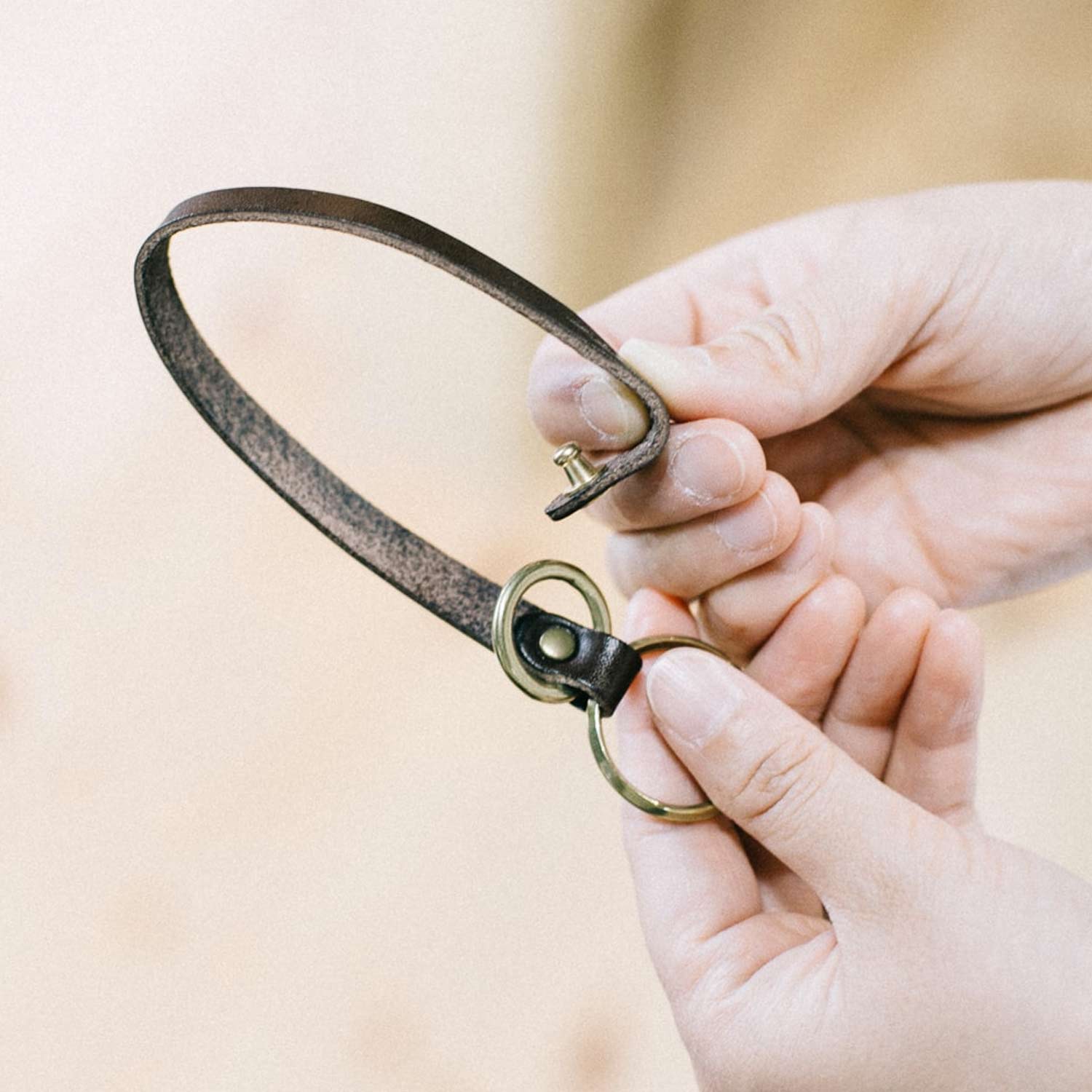 A long leather hook key chain with by Duram, a leather goods company from Fukuoka, Japan. The leather hook snaps into place through a button slit. Button and chain made of brass. Dimension: (W)1.2” x (H)5.2” x (D)0.1”