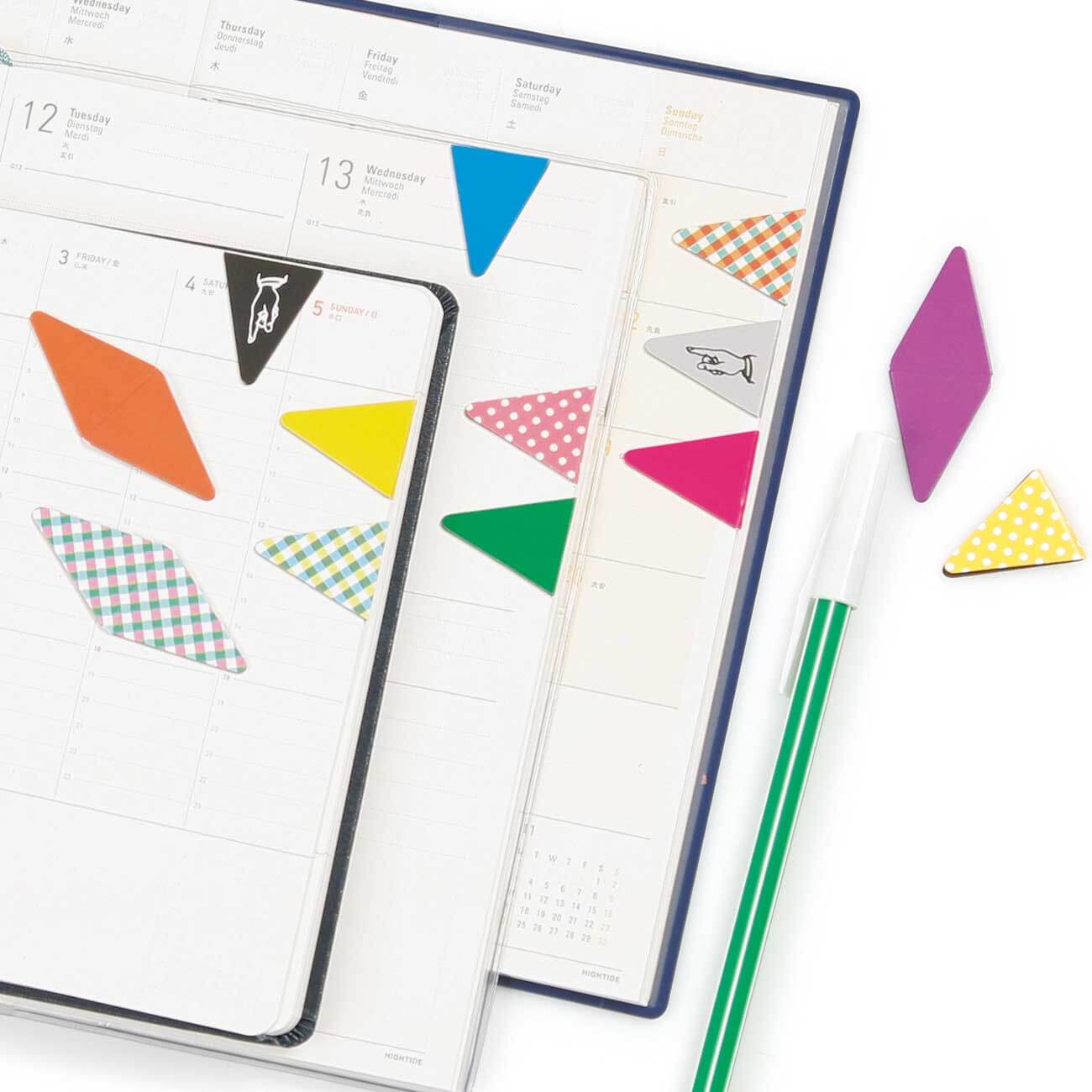 A diamond shape folds over a page to create a triangular flag-like bookmark. Can be used as a regular bookmark on planners and books, or to “call out” a specific information on a page. Can also be used to clip together greeting cards or letters, or as an accent on a gift wrap.
