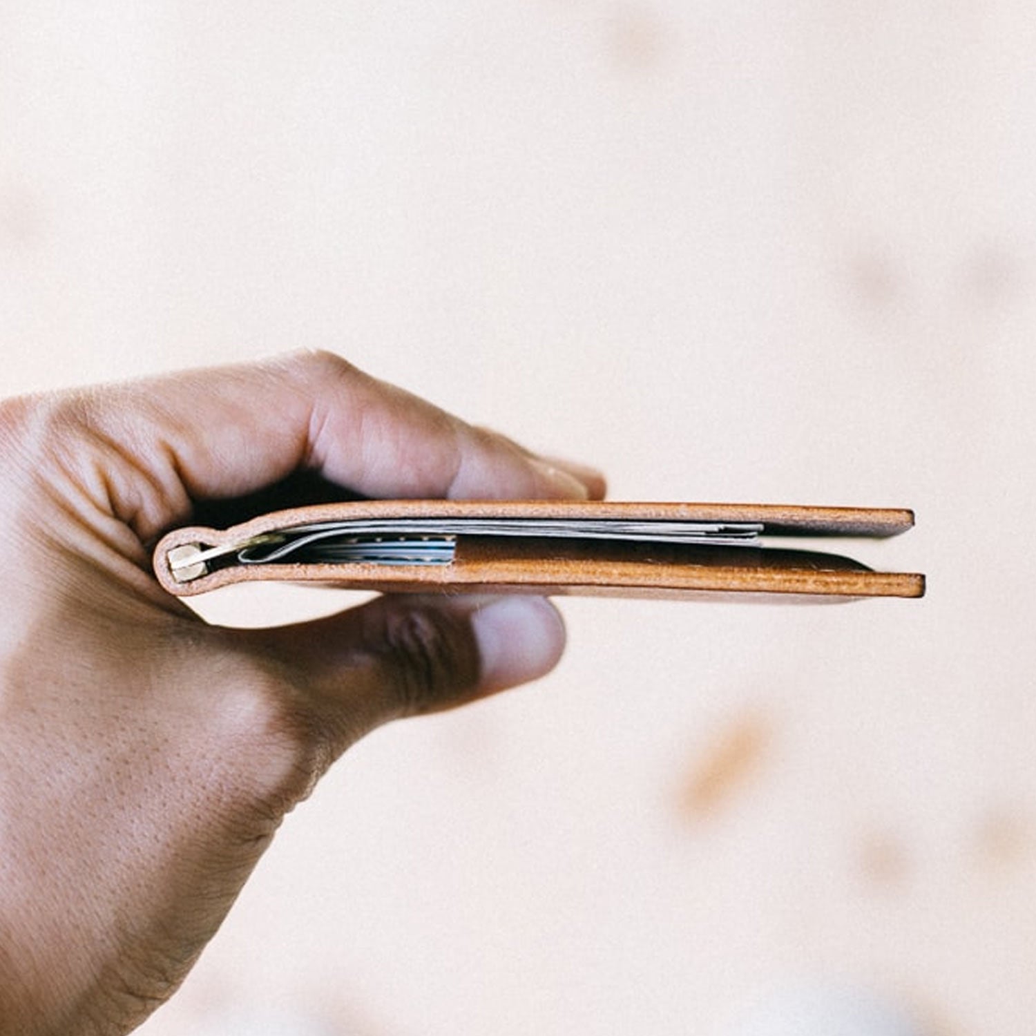 A hand-stitched money clip by Duram, a leather goods company from Fukuoka, Japan. Clip made of brass.