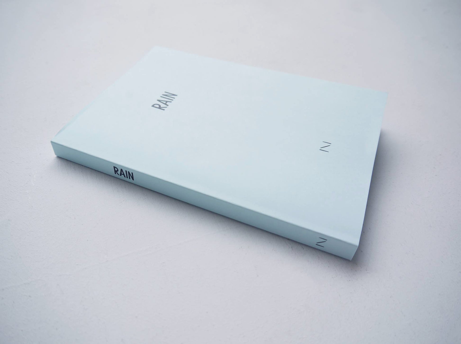 A soft cover notebook with blank blue pages, designed on the theme of rain by Noritake.