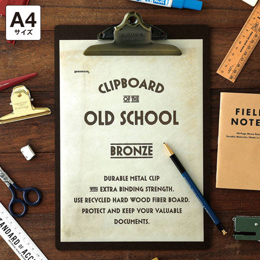 An old-school clip board made of recycled hard wood fiber with a bronze metal clip by Penco. Also available in A5 size.