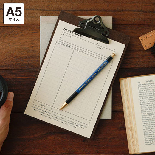 An old-school clip board made of recycled hard wood fiber with a bronze metal clip by Penco. Also available in A4 size.