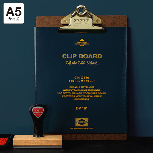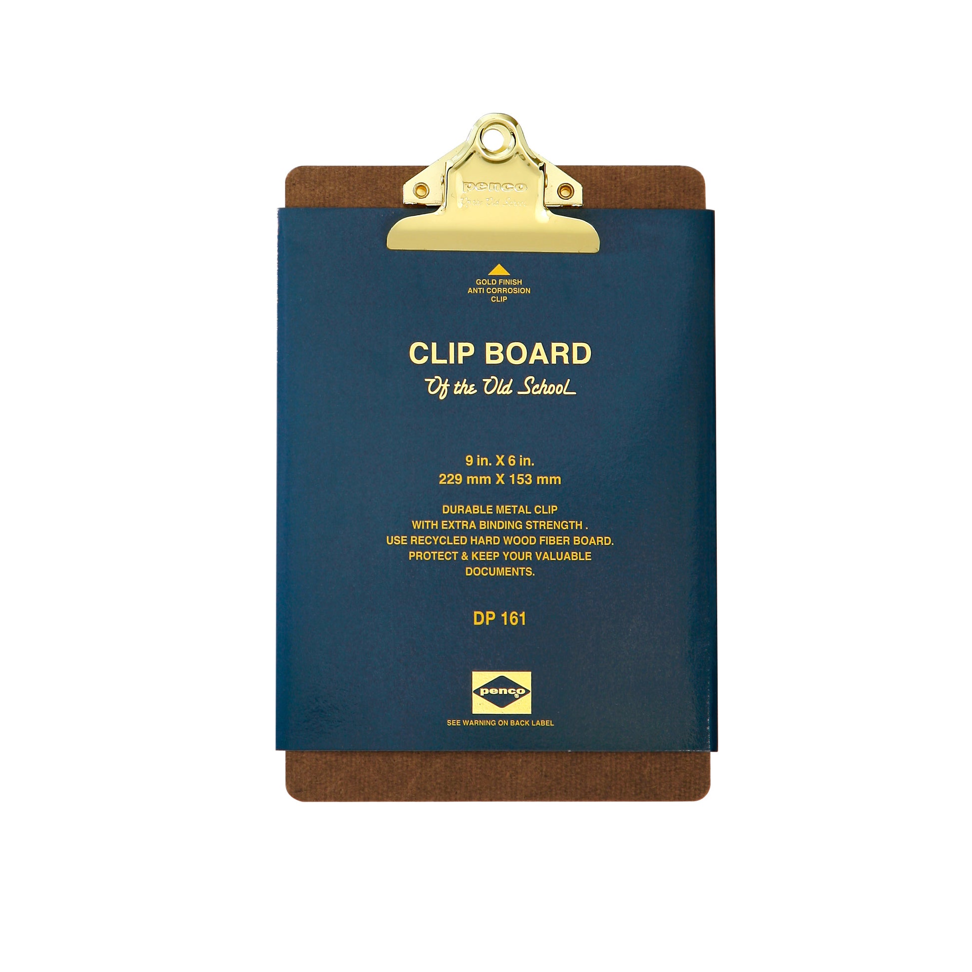 An old-school clip board made of recycled hardwood fiber with a gold metal clip by Penco. Also available with a silver clip.
