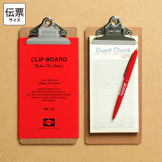 An old-school clip board made of recycled hardwood fiber with a silver metal clip by Penco. Perfect size for clipping a checkbook or receipts. Also available with a gold clip.
