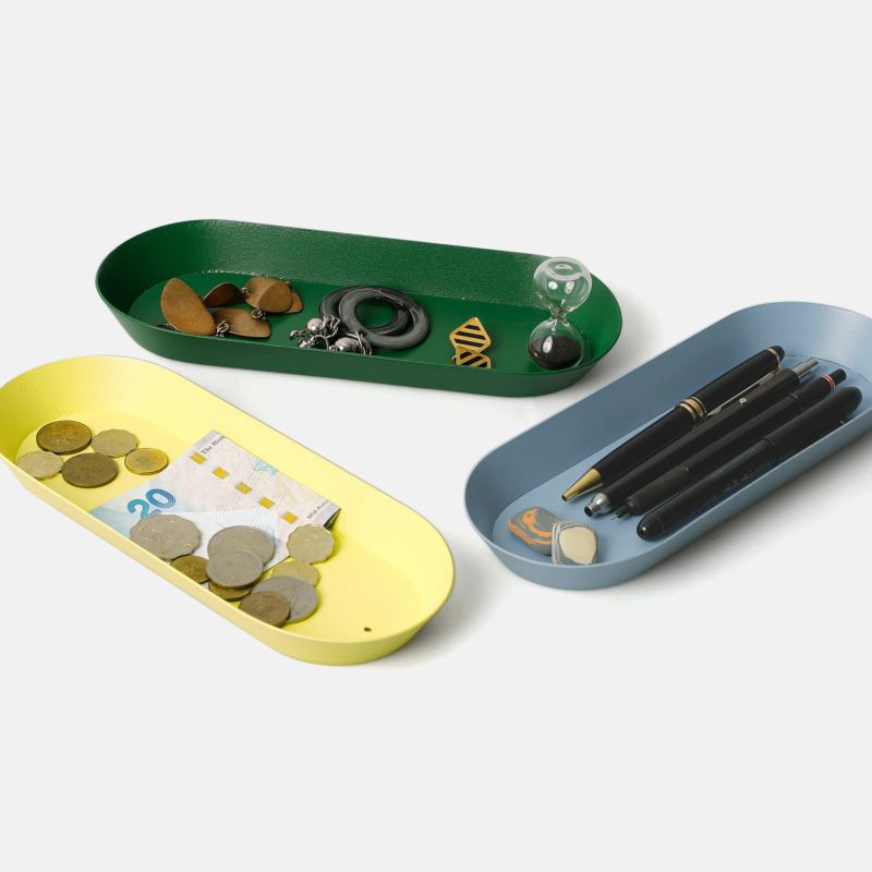 Multi-purpose minimal tray made of bright-colored steel. For pens or keys, or as cash tray.