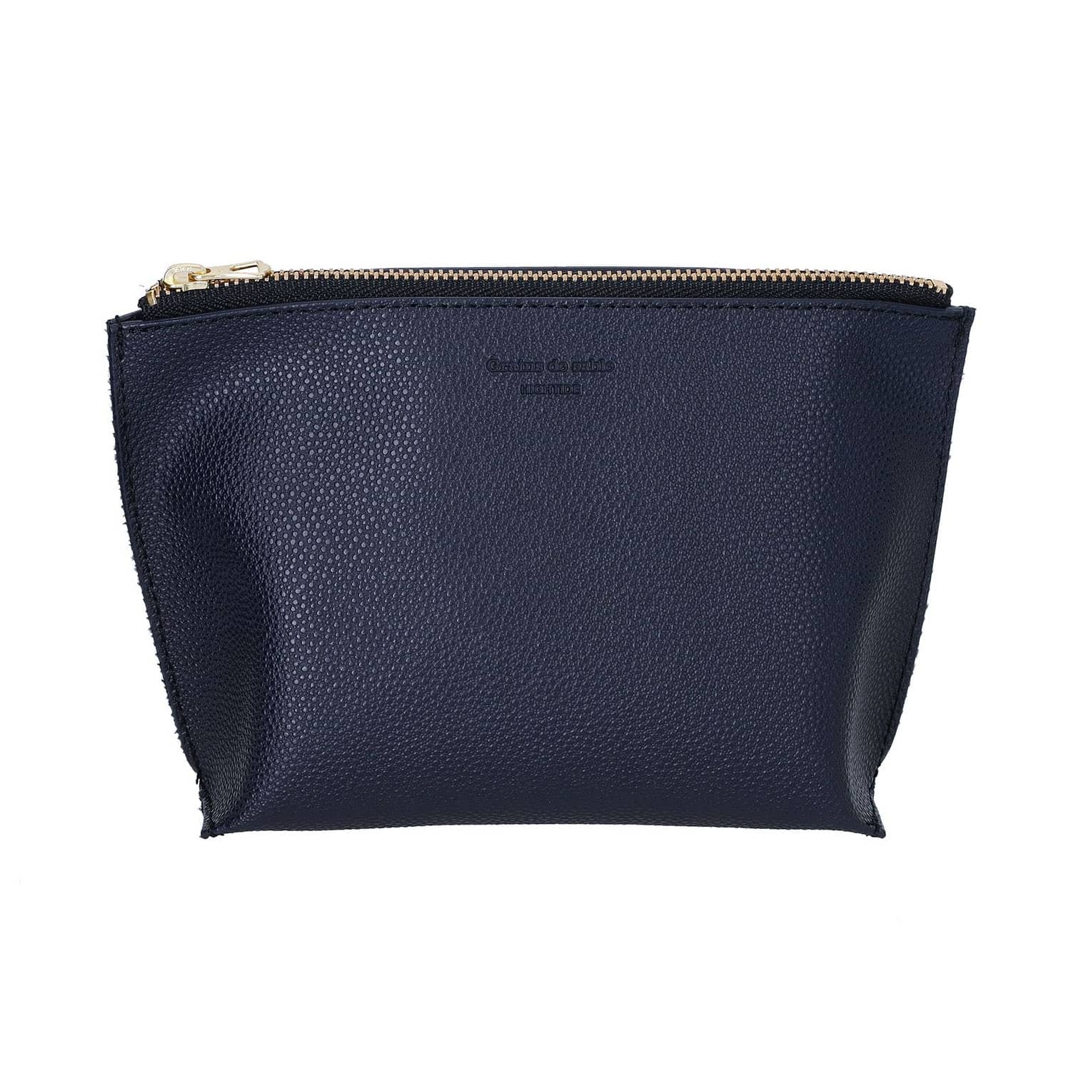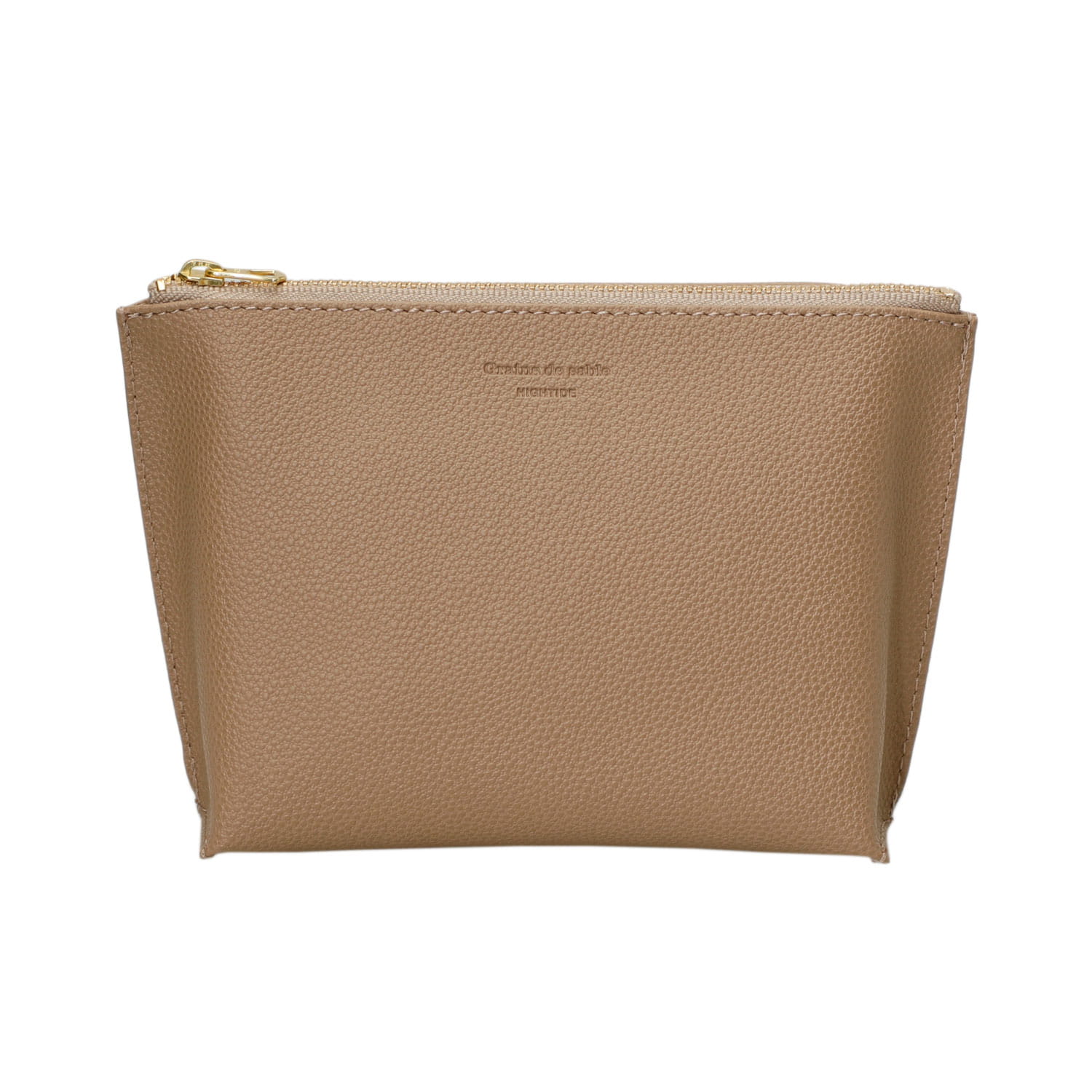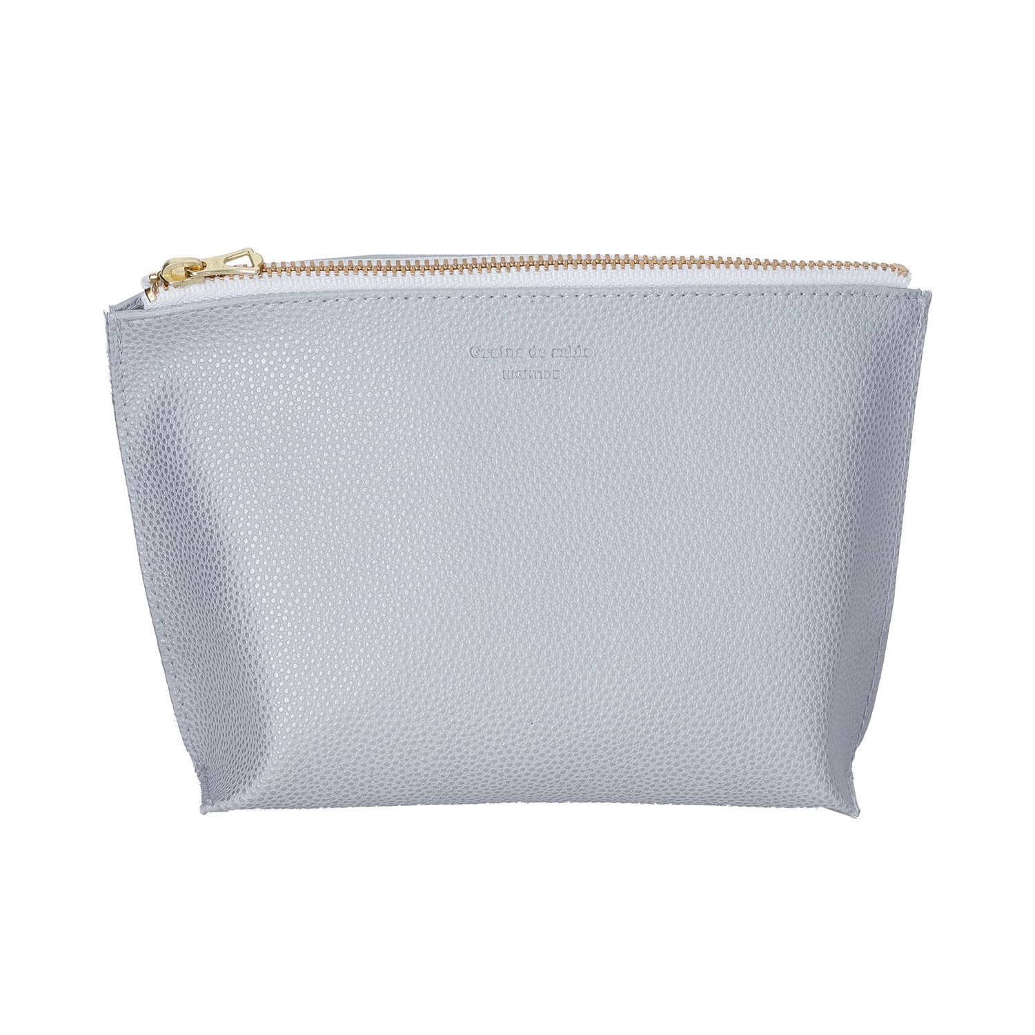 A medium pebble-textured PVC leather pouch with a zipper closure by Hightide. Part of Grains de Sable collection. Elegant rectangular form comes with a slightly rounded edge, with gusset at the bottom for extra storage space. Contrasting gold zipper adds a sophisticated, somewhat nostalgic feel to its supple faux-leather body.