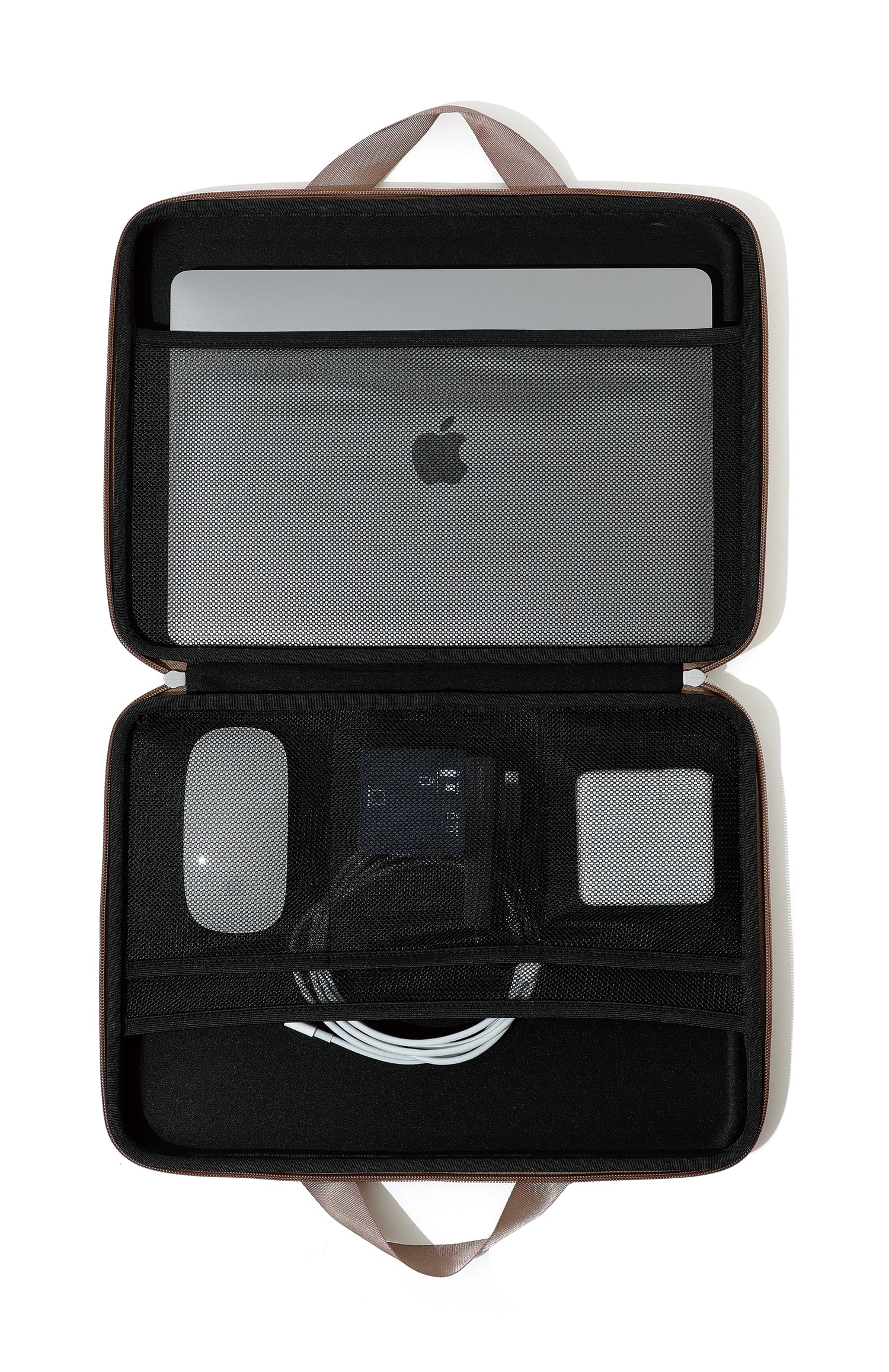 The lightweight yet sturdy case can safely store a laptop up to 14 inches wide, along with the battery, cables, and adaptors.