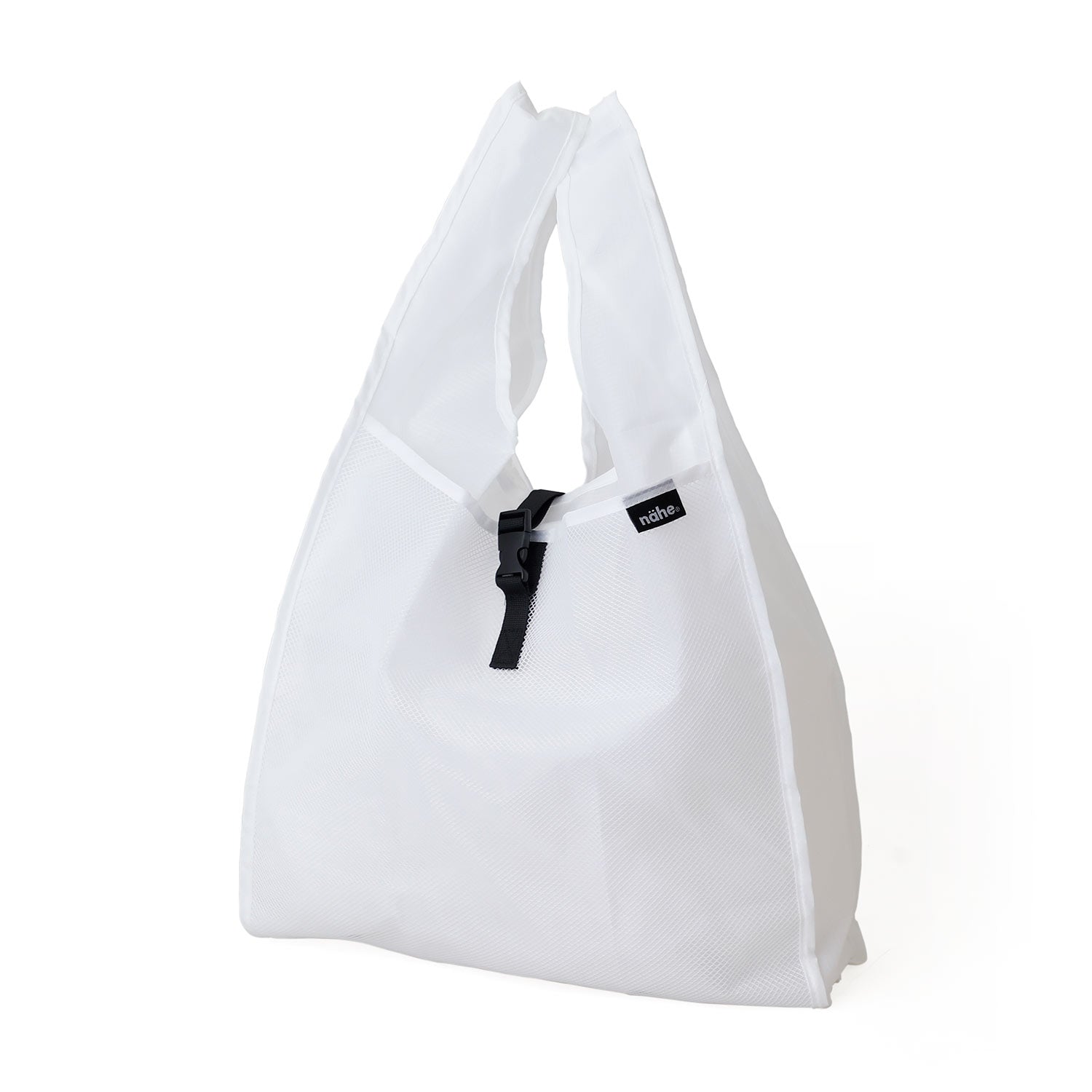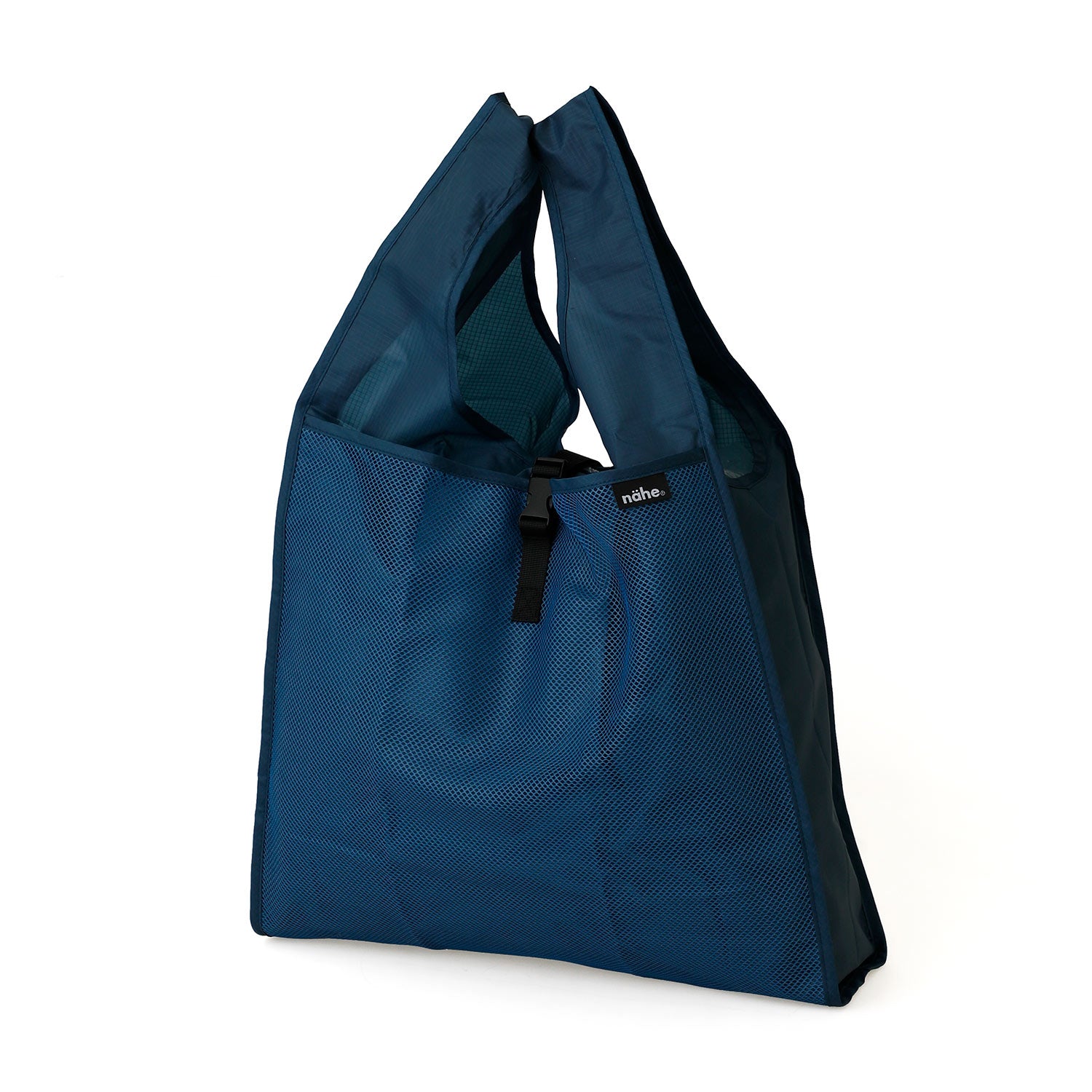 A functional polyester bag that folds up compactly with a buckle closure by Hightide. Eco-friendly and convenient choice for grocery shopping or traveling. The front mesh pocket can store wallets, phones or easy-to-reach items, to be separated from grocery food items. The large bag can contain up to six 0.5 gallon liquid cartons. Neatly folds up into a palm-size with its attached buckle, which also acts as a bag closure. Dimension: (W)16.5" x (H)26" x (D)5”